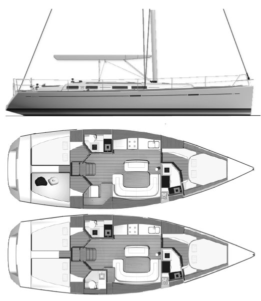 The hull shape is fast and due to her 4.16 m (13.65 ft) beam, provides a decent amount of floor space to stretch your legs in the main saloon and feel at home. A powerful, central heating system makes the difference when you retire after a hard day’s sail and feel like snuggling up or first thing before the sun has heated up the cockpit enclosure!